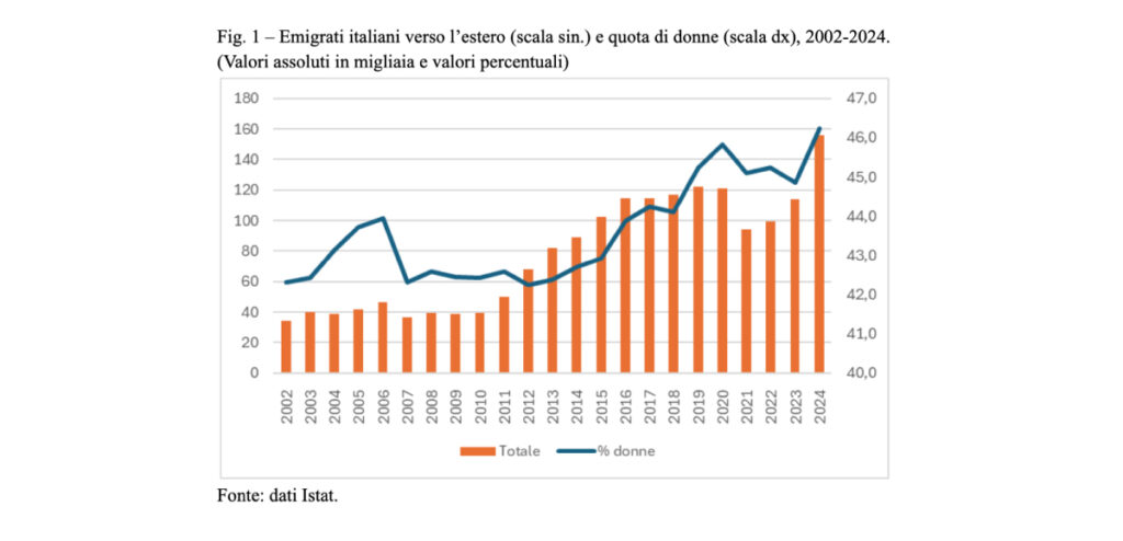 Appare poi significativo che tra i laureati che si trasferiscono all’estero, le donne dal 2018 sono sempre state sopra il 47% e nel 2024 sono diventate la maggioranza del flusso con il 50,5%. La presenza femminile è quindi ancora più elevata all’interno del flusso a maggiore qualificazione dell’emigrazione italiana. Del resto, come è stato già notato2, non siamo più in presenza di una emigrazione femminile per ricongiungimento familiare, ma siamo davanti a donne che sono molto spesso le attrici principali della loro migrazione e, a volte, anche di quella dei loro congiunti. Donne attratte da mercati del lavoro con un minore gender gap, probabilmente non solo nelle professioni ad alta qualificazione ma anche nelle altre, e da livelli salariali mediamente più elevati di quelli italiani. Una situazione che riguarda tutte le fasce del mercato del lavoro e tutti i livelli di istruzione, il risultato è che da qualche anno l’intensità, le destinazioni e le caratteristiche dell’emigrazione femminile italiana sono sempre più simili a quelle della componente maschile. Le giovani donne, infatti, raramente ormai partono per seguire o raggiungere il proprio partner e sono anche più presenti nella mobilità studentesca. La specificità dell’emigrazione femminile attuale sta proprio, con ogni probabilità, in questa conquistata autonomia che le ha portate a diventare un soggetto indipendente, sempre più importante e centrale, anche dal punto di vista quantitativo, e meritevole di molta più attenzione da parte della ricerca sociale e della stessa politica.