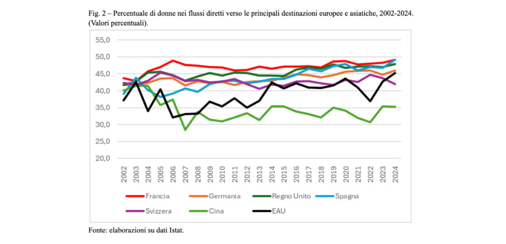 1Percentuali in linea con quelle registrate per i paesi europei si hanno anche nei principali flussi diretti nell’America del Nord e del Sud. Nel 2024, oltre al già ricordato valore dell’Argentina, la quota di donne emigrate è stata infatti pari al 46,6% nel flusso verso gli Stati Uniti e al 48,6% per quello diretto in Brasile.