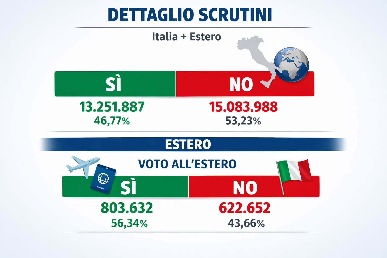 Il 53,7% degli elettori italiani dice no alla separazione delle carriere e ai nuovi organi di autogoverno; tra gli italiani all’estero prevale invece il Sì, mentre in Italia il No trionfa in 17 regioni su 20 con affluenza superiore al 58%
