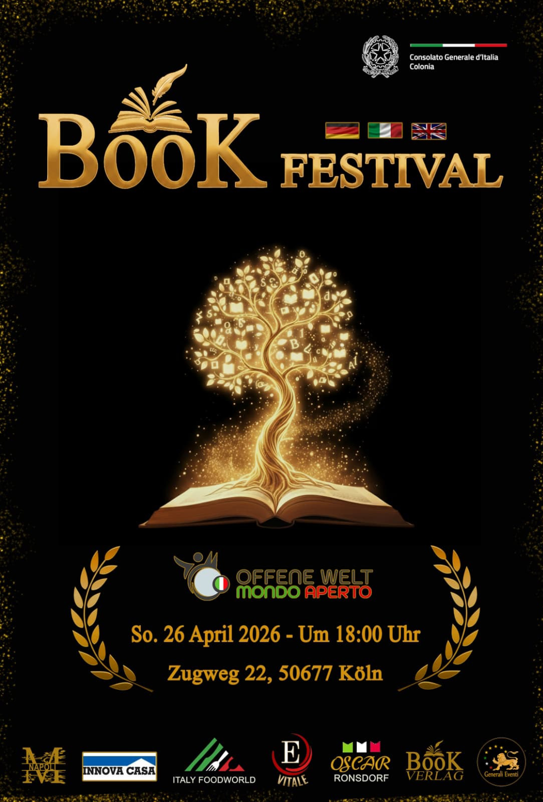 Il 26 aprile 2026, dalle ore 18:00 alle ore 20:00, l’Associazione Mondo Aperto (Colonia) ospiterà il BOOK FESTIVAL 2026, un evento culturale di grande rilevanza organizzato dal team di Book Verlag, casa editrice italo-tedesca fondata da Maurizio Del Greco.