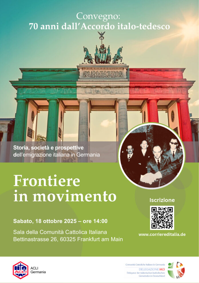 Storia, società e prospettive dell’emigrazione italiana in Germania a 70 anni dall’Accordo italo-tedesco. Quando: 18 ottobre. Dove: Francoforte. Il Convegno è organizzato da ACLI Germania, Delegazione MCI Germania e Corriere d’Italia.